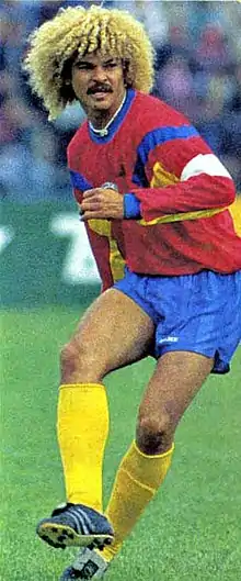 Valderrama's most instantly recognisable physical features were his big afro-blonde hairstyle, jewelry, and moustache,[19] but he was best known for his grace and elegance on the ball, as well as his agility, and quick feet as a footballer. His control, dribbling ability and footwork were similar to those of smaller players, which for a player of Valderrama's size and physical build was fairly uncommon, and he frequently stood out throughout his career for his ability to use his strength, balance, composure, and flamboyant technique to shield the ball from opponents when put under pressure, and retain possession in difficult situations, often with elaborate skills, which made him an extremely popular figure with the fans. Valderrama's mix of physical strength, two-footed ability, unpredictability and flair enabled him to produce key and incisive performances against top-tier teams, while his world class vision and exceptional passing and crossing ability with his right foot made him one of the best assist providers of his time; his height, physique and elevation also made him effective in the air, and he was also an accurate free kick taker and striker of the ball, despite not being a particularly prolific goalscorer.[6][7][8]