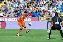 With his goal against Atlanta United FC on 26 July, Vela drew level with Erick Torres as the highest scoring Mexican in MLS history with 36 goals.[79] On 17 August, Vela scored his 24th goal of the 2019 MLS season from the penalty spot in a 2–0 away win over Real Salt Lake, which saw LAFC clinch the playoffs. With this goal, Vela broke Sebastian Giovinco's 2015 MLS single-season record of most combined goals and assists, with his 39th point of the season (24 goals and 15 assists), one more than Giovinco's 38 (22 goals and 16 assists).[80][81][82] On 25 September, Vela scored the opening goal in a 3–1 home win over the Houston Dynamo from the penalty spot; the victory saw LAFC clinch the Supporters' Shield.[83] On 29 September, Vela scored his 31st goal of the 2019 MLS season in a 1–1 away draw against Minnesota United FC, equaling Josef Martínez's record for most goals in a single MLS season.[84] He broke Martínez's record on 6 October, when he scored a hat-trick in a 3–1 home win over the Colorado Rapids. He finished the season with a record 34 goals and 15 assists, for a combined record of 49 points,[85] which earned him the MLS Golden Boot award as the league's top-scorer.[86]