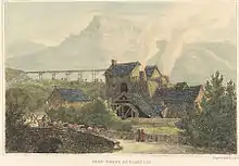 The first industrial canal in Wales was built in 1768 to convey coal from the Gwendraeth Valley to the coast, and the following year, the earliest tramroad bridge was on the tramroad built alongside the canal.[7] During the Napoleonic Wars (1799–1815) there was increased demand for coal, iron and agricultural goods, and the county prospered. The landscape changed as much woodland was cleared to make way for more food production, and mills, power stations, mines and factories sprang up between Llanelli and Pembrey.[7] Carmarthenshire was at the centre of the Rebecca Riots around 1840, when local farmers and agricultural workers dressed as women and rebelled against higher taxes and tolls.[9]