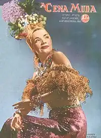 She starred in the next co-production from the Waldow and Cinédia studios, the musical Hello, Hello, Carnival! (1936), which contained a roll call of popular music and radio performers (including Miranda's sister, Aurora). A standard backstage plot permitted 23 musical numbers and, by contemporary Brazilian standards, the film was a major production. Its set reproduced the interior of Rio's plush Atlântico casino (where some scenes were filmed) and was a backdrop for some of its musical numbers.[27] Miranda's stardom is evident in a film poster with a full-length photograph of her and her name topping the cast list.[28]