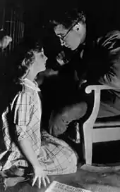 Lombard was eager to win an Academy Award, and selected her next project with the expectation that it would bring her the trophy.[110] Vigil in the Night (1940), directed by George Stevens, featured Lombard as a nurse who faces a series of personal difficulties. Although the performance was praised, she did not get her nomination, as the sombre mood of the picture turned audiences away and box-office returns were poor.[111] Despite the realization that she was best suited to comedies,[112] Lombard completed the drama They Knew What They Wanted (1940), co-starring Charles Laughton, which was mildly successful.[113]