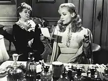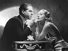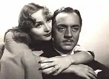While continuing with a slower work-rate, Lombard decided to move away from comedies and return to dramatic roles.[105] She appeared in Made for Each Other (1939) with James Stewart playing a couple facing domestic difficulties.[106] Reviews for the film were highly positive, and praised Lombard's dramatic effort; financially, it was a disappointment.[107] Lombard's next appearance came with Cary Grant in the John Cromwell romance In Name Only (1939), a credit she personally negotiated with RKO Radio Pictures upon hearing of the script and Grant's involvement.[108] The role reflected her recent experiences, as she played a woman in love with a married man whose wife refuses to divorce. She was paid $150,000 for the film, continuing her status as one of Hollywood's highest-paid actresses, and it was a moderate success.[109]