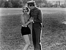 The marriage to Powell increased Lombard's fame,[45] while she continued to please critics with her work in Up Pops the Devil and I Take this Woman (both 1931).[46] In reviews for the latter film, which co-starred Gary Cooper, several critics predicted that Lombard was set to become a major star.[47] She went on to appear in five films throughout 1932. No One Man and Sinners in the Sun were not successful,[48] but Edward Buzzell's romantic picture Virtue was well received.[49] After featuring in the drama No More Orchids, Lombard was cast as the wife of a con artist in No Man of Her Own[49] with Clark Gable[50] The film was a critical and commercial success, and Wes Gehring writes that it was "arguably Lombard's finest film appearance" to that point.[51] It was the only picture that Gable and Lombard made together. There was no romantic interest at this time, however, as she recounted to Garson Kanin: "[we] did all kinds of hot love scenes ... and I never got any kind of tremble out of him at all".[52][note 2]