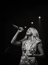 In early 2014, she performed on the Rock and Roll Hall of Fame Induction Ceremony, paying tribute to Linda Ronstadt.[200] Her performances were highly acclaimed by critics and even by Stevie Nicks, who performed with Underwood.[201] In September, Underwood headlined the 2014 Global Citizen Festival, alongside Jay-Z, No Doubt and other music acts.[202] Her cover of R.E.M.'s "Everybody Hurts" during her performance was highly praised.[203][204] She headlined the 2014 Concert for Valor in November, alongside Eminem, Metallica, Foo Fighters, and other music acts, where she was backed by the Singing Sergeants of the US Air Force during the performance of "Something in the Water".[205] Underwood was asked by Bono himself to front U2's World AIDS Day (RED) Concert, alongside U2, Bruce Springsteen, Coldplay's Chris Martin, and Kanye West, on December 1, 2014. She was joined on stage by U2 guitarist The Edge during a performance of her song "Change", which received acclaim.[206]