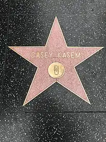 In 1981, Kasem was granted a star on the Hollywood Walk of Fame.[79] He was inducted into the National Association of Broadcasters Hall of Fame radio division in 1985,[80] and the National Radio Hall of Fame in 1992. Five years later, he received the Radio Hall of Fame's first Lifetime Achievement Award.[8] In 2003, Kasem was given the Radio Icon award at the Radio Music Awards.[79]