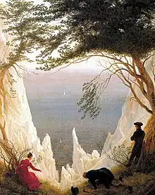 Landscapes were his preferred subject, inspired by frequent trips, beginning in 1801, to the Baltic coast, Bohemia, the Krkonoše and the Harz Mountains.[16] Mostly based on the landscapes of northern Germany, his paintings depict woods, hills, harbors, morning mists and other light effects based on a close observation of nature. These works were modeled on sketches and studies of scenic spots, such as the cliffs on Rügen, the surroundings of Dresden and the river Elbe. He executed his studies almost exclusively in pencil, even providing topographical information, yet the subtle atmospheric effects characteristic of Friedrich's mid-period paintings were rendered from memory.[17] These effects took their strength from the depiction of light, and of the illumination of sun and moon on clouds and water: optical phenomena peculiar to the Baltic coast that had never before been painted with such an emphasis.[18]