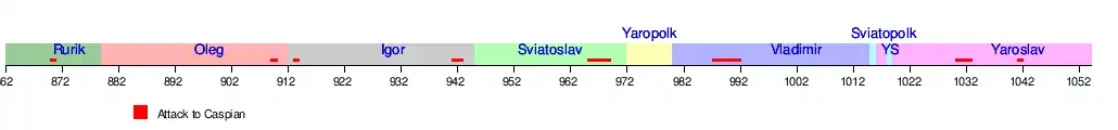1. 'Sometime during the reign of Hasan Ibn Zaid, ruler of Tabaristan (r.864–884), the Rus sailed into the Caspian Sea and unsuccessfully attacked the eastern shore at Abaskun. This was probably a raid on very small scale (...) Great raids, however, took place in c. 913, in 943, in 965 and in c. 1041.'[1]