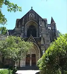 Cram presented a master plan for the cathedral close's buildings in October 1911,[66][116] and his revised designs for the main structure were completed in 1913.[117][118][119] Regardless, there was still not enough money to complete the cathedral's construction, as the New York Episcopal Diocese Cathedral League had mentioned in 1912 that $5.5 million was still needed.[120] The diocese was able to construct several structures to the south of the main building (see § Cathedral close),[117] as part of a plan that had been approved by the trustees in late 1911.[66] These structures included the St. Faith's House (1909), Synod House (1911–1913), Cathedral School (1912–1913), and Cathedral House (1912–1914).[121]