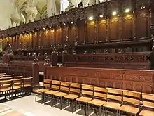 On December 18, 2001, a fire swept through the unfinished north transept, destroying the gift shop and damaging tapestries.[190][191][192] Despite the damage sustained, St. John's reopened two weeks later.[193] Though the pipe organ was not damaged, all its pipes and other component parts were removed and restored.[194] Valuable tapestries and other items in the cathedral were damaged by the smoke.[195] In January 2005, the cathedral began a major restoration to not only remove smoke damage resulting from the 2001 fire, but also clean the 80 years of dirt accumulation in the nave.[196] The renovations temporarily depleted St. John's funds: the unaffected portions of the cathedral started to deteriorate, staff salary raises were deferred, and several staff positions were eliminated.[197] The scaffolding around the south tower was removed in 2007,[189] and the cathedral was rededicated on November 30, 2008.[195]