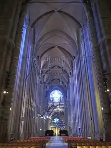 When construction of the Women's Transept resumed in 1934, the nave and the western elevation were nearly complete except for the two towers above the western facade, but work on the crossing tower and south transept had yet to commence.[149] By 1938, the nave was completed, but the temporary construction wall between the nave and crossing was still in place because the Byzantine-Romanesque crossing's design had yet to be harmonized with the Gothic nave.[150] As such, Cram subsequently replaced the portions of the ceiling above the choir and the apse's eastern section. Additionally, the nave started to be used for services, even though it had not yet been dedicated.[108] The 1939 WPA Guide to New York City stated that $20 million had been spent on the cathedral by then.[151]