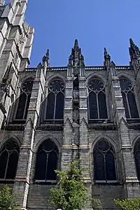 On the northern and southern elevations, there are four vertical "double bays", each with two columns of windows. Large arched buttresses, with two piers each, separate the different double bays; smaller buttresses, containing a single pier, divide each double bay into smaller "sub-bays".[232] This alternation of large and small buttresses gives the appearance of four double bays with two sub-bays each, rather than eight singular rectangular bays.[243] At the arcade level, each of the sub-bays contains an arrangement of stained glass with two lancet windows under a rose window.[244] The sub-bays also contain another stained-glass arrangement at clerestory level, each with two lancet windows and one rose window. The clerestory arrangements each measure 45 feet (14 m) long by 12 feet (3.7 m) wide.[244][245] Carved parapets, as well as gables with dormers, run along the copper roof.[244]