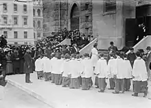 Construction on the Cathedral of St. John the Divine was begun with the cornerstone-laying ceremony on December 27, 1892, St. John's Day.[60][61] One thousand tickets for seats at the ceremony were distributed,[62] though the actual attendance was 1,100.[61] The cornerstone contained various objects such as a Bible and church papers.[61] Potter hit the stone three times with a mallet and said "Other foundation can no man lay, than that is laid which is Jesus Christ."[63] The following month, the remaining $175,000 for land acquisition had been secured,[64] and the trustees moved to take title to the land, including the cathedral close around the cathedral's main building, in April.[65] Unlike the main building, the cathedral close was not designed under a single master plan, and during the 1890s and 1900s, several proposals would be made for the site.[66]