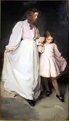 Beaux attended Sartain's classes for two years, then rented her own studio and shared it with a group of women artists who hired a live model and continued without an instructor. After the group disbanded, Beaux set in earnest to prove her artistic abilities. She painted a large canvas in 1884, Les Derniers Jours d'Enfance, a portrait of her sister and nephew whose composition and style revealed a debt to James McNeill Whistler and whose subject matter was akin to Mary Cassatt's mother-and-child paintings.[25] It was awarded a prize for the best painting by a female artist at the Academy, and further exhibited in Philadelphia and New York. Following that seminal painting, she painted over 50 portraits in the next three years with the zeal of a committed professional artist. Her invitation to serve as a juror on the hanging committee of the Academy confirmed her acceptance amongst her peers.[26] In the mid-1880s, she was receiving commissions from notable Philadelphians and earning $500 per portrait, comparable to what Eakins commanded.[27] When her friend Margaret Bush-Brown insisted that Les Derniers was good enough to be exhibited at the famed Paris Salon, Beaux relented and sent the painting abroad in the care of her friend, who managed to get the painting into the exhibition.[27]