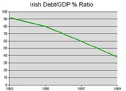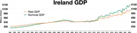 At the start of the 1990s, Ireland was a relatively poor country by Western European standards, with high poverty, high unemployment, inflation, and low economic growth.[1] The Irish economy expanded at an average rate of 9.4% between 1995 and 2000, and continued to grow at an average rate of 5.9% during the following decade until 2008, when it fell into recession. Ireland's rapid economic growth has been described as a rare example of a Western country matching the growth of East Asian nations, i.e. the 'Four Asian Tigers'.[2]