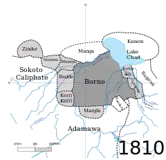The Kanuri people of West Africa led by the Sayfuwa migrated to the west and south of the lake, where they established the Bornu Empire. By the late 16th century the Bornu empire had expanded and recaptured the parts of Kanem that had been conquered by the Bulala. [13] Satellite states of Bornu included the Damagaram in the west and Baguirmi to the southeast of Lake Chad.