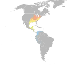 The breeding range extends from southern Tennessee to southern Ontario, and is bounded in the east by the Atlantic Ocean and on the west by the Great Plains. The majority of the population breeds in forests of the Appalachian mountains,[28] with smaller numbers in forests throughout the United States and Canada. Historically, the cerulean warbler was common to abundant as far south as Alabama and Mississippi, but loss of habitat in these southern regions has caused the centre of its breeding range to shift northwards.[29]