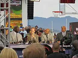 Barkley was popular with the fans and media and made the NBA's All-Interview Team for his last 13 seasons in the league.[6] He was frequently involved in on- and off-court fights and sometimes stirred national controversy, as in March 1991 when he spat on a young girl while attempting to spit at a heckler,[7] and 1993 when he declared that sports figures should not be considered role models.[8] Since retiring as a player, Barkley has had a successful career as an NBA analyst. He works for TNT on Inside the NBA alongside Shaquille O'Neal, Kenny Smith, and Ernie Johnson as a studio pundit for its coverage of NBA games (for which he has won four Sports Emmy Awards).[9] In addition, Barkley has written several books and has shown an interest in politics.[10][11]