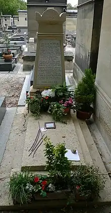 His financial difficulties increased again, however, particularly after his publisher Poulet Malassis went bankrupt in 1861. In 1864, he left Paris for Belgium, partly in the hope of selling the rights to his works and to give lectures.[30] His long-standing relationship with Jeanne Duval continued on-and-off, and he helped her to the end of his life. Baudelaire's relationships with actress Marie Daubrun and with courtesan Apollonie Sabatier, though the source of much inspiration, never produced any lasting satisfaction. He smoked opium, and in Brussels he began to drink to excess. Baudelaire suffered a massive stroke in 1866 and paralysis followed. After more than a year of aphasia, he received the last rites of the Catholic Church.[31] The last two years of his life were spent in a semi-paralyzed state in various "maisons de santé" in Brussels and in Paris, where he died on 31 August 1867. Baudelaire is buried in the Cimetière du Montparnasse, Paris.