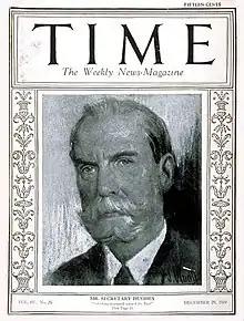 Hughes's success made him a popular public figure in New York, and he was appointed counsel to the Armstrong Insurance Commission, which investigated the major life insurance companies headquartered in New York.[16] His examination of the insurance industry uncovered payments made to journalists and lobbyists as well as payments and other forms of compensation directed to legislators serving throughout the country. His investigation also showed that many top insurance executives had various conflicts of interest and had received huge raises at the same time that dividends to policyholders had fallen. Seeking to remove Hughes from the investigation, Republican leaders nominated him as the party's candidate for Mayor of New York City, but Hughes refused the nomination. His efforts ultimately resulted in the resignation or firing of the most of the top-ranking officials in the three major life insurance companies in the United States.[17] Following the investigation, Hughes convinced the state legislature to bar insurance companies from owning corporate stock, underwriting securities, or engaging in other banking practices.[16]