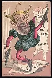 Despite the "group marriage" aspects of the Oneida Community, Guiteau was generally rejected during his five years there and his name was turned into a play on words to create the nickname "Charles Gitout".[8][9] He left the community twice; the first time, he went to Hoboken, New Jersey, and attempted to start a newspaper based on the Oneida religion, called The Daily Theocrat.[5] This failed and he returned to Oneida, only to leave again and file lawsuits against Noyes, in which he demanded payment for the work he had supposedly performed on behalf of the Oneida Community.[7] Guiteau's embarrassed father wrote letters in support of Noyes, who considered Guiteau irresponsible and insane.[10]