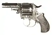 Guiteau conceded that the president would be too strong to kill with a knife, stating, "Garfield would have crushed the life out of me with a single blow of his fist!" He settled on a gun after contemplating what weapon he would use.[28] Guiteau felt that God told him to kill the president; he felt that such an act would be a "removal" as opposed to an assassination. He also felt that Garfield needed to be killed to rid the Republican Party of Blaine's influence.[6] Borrowing $15 from George Maynard, a relative by marriage,[29] Guiteau set out to purchase a revolver. He knew little about firearms, but believed he would need a large-caliber gun.[30] While shopping at O'Meara's store in Washington, he had to choose between a .442 Webley caliber British Bulldog revolver[29] with wooden grips or one with ivory grips.[30] He preferred the one with the ivory handle because he thought it would look better as a museum exhibit after the assassination.[30] Though he could not afford the extra dollar for the ivory grips, the store owner dropped the price for him.[31] He spent the next few weeks in target practice – the recoil from the revolver almost knocked him over the first time he fired it.[32] Guiteau's weapon was recovered after the assassination and given to the Smithsonian, but it has since been lost.[33]
