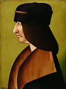 Charles was a man of very short stature and ill health, described as monstrous by the Italians, so much so that Jacopo d'Atri felt compelled to communicate to the Marquise Isabella d'Este that the king "is not as deformed as our people describe him".[27] He had a big head, short crooked legs, six toes per foot ;[28] He was also afflicted with a persistent tremor in his hands. According to chronicler Marin Sanudo, he did not wear a helmet because his weak complexity did not allow him to do so. Contemporaries agreed that its only beauty was the look, in which there was a certain nobility.[29]
