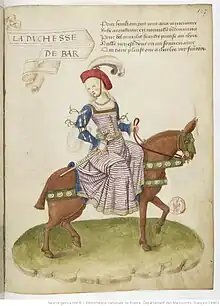 The manuscript Les dictz des femmes de diverses nations contains a miniature of the "duchesse de Bar", accompanied by a rhyming caption: "For proud bearing and merry countenance / Sumptuous costume in the new style / For kind welcome and choice beauty / There is no one in memory / Who has ever so pleased Charles the French King."[46] Referring to the sumptuous Milanese welcome in Asti and her actual exuberance in dress, which so impressed French visitors, the historian René Maulde-La-Clavière identified this woman in the Duchess of Bari, Beatrice d'Este.[47] In fact, her husband Ludovico was also called "duc de Bar" in French[48] and Charles himself addressed him with this title: "notre trés cher et trés amé cousin, le seigneur Ludovic, duc de Bar".[49] The hypothesis would be confirmed by the fact that Louis d'Orléans unequivocally called Beatrice "la duchesse de Bar".[50] The miniature shows a young woman riding a mule, wearing a showy feathered hat, a dress with horizontal stripes, a wand in her hand, and a dagger belted at her side. However, it would not appear to be a portrait of Beatrice, nor was she ever the king's lover, therefore the verses should be understood only in relation to gallant receptions, and not dedicated to a "mistress" of the king, as supposed by some. Other historians have identified this woman with the then Duchess of Bar, Philippa of Guelders (1467–1547), who died as a nun and in the odour of sanctity, and even in this case it does not appear that she was ever Charles's lover.[51]