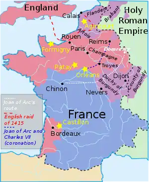 With his court removed to Bourges, south of the Loire river, Charles was disparagingly called the "King of Bourges", because the area around this city was one of the few remaining regions left to him. However, his political and military position improved dramatically with the emergence of Joan of Arc as a spiritual leader in France. Joan and other charismatic figures led French troops to lift the sieges of Orléans and other strategic cities on the Loire river, and to crush the English at the Battle of Patay. With the local English troops dispersed, the people of Reims switched allegiance and opened their gates, which enabled the coronation of Charles VII at Reims Cathedral in 1429. Six years later, he ended the English-Burgundian alliance by signing the Treaty of Arras with Burgundy, followed by the recovery of Paris in 1436 and the steady reconquest of Normandy in the 1440s using a newly organized professional army and advanced siege cannons. Following the Battle of Castillon in 1453, the French expelled the English from all their continental possessions except the Pale of Calais.