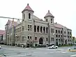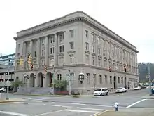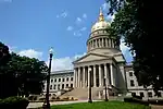 The city's first chemical manufacturer began operation in 1913.[13] Three years later, the Libbey-Owens-Ford glass manufactory was built,[23] as well as Charleston High School. Another large manufacturer, Owens Bottle Company, opened in 1917. Charleston City Hall was built in 1921. In the same year, a fire at the capitol building resulted in a new, hastily built structure being opened, but it too burned down in 1927. A Capitol Building Commission, created by the legislature in 1921, authorized construction of the present capitol. Architect Cass Gilbert designed the buff-colored Indiana limestone structure in the Italian Renaissance style, with a final cost of just under $10 million. After the three stages of construction were completed, Governor William G. Conley dedicated the West Virginia State Capitol on June 20, 1932. Charleston Municipal Airport was established in 1909.[16] In 1934, the city library expanded to become the Kanawha County Public Library system.[22] In 1935, Morris Harvey College relocated to Charleston from Barboursville, West Virginia.[24]