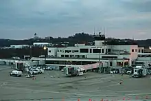 Charleston Municipal Auditorium was completed in 1939.[13] During World War II, the first and largest styrene-butadiene plant in the U.S. opened in nearby Institute, providing a replacement for rubber to the war effort.[25] After the war ended, Charleston was on the brink of some significant construction. One of the first during this period was Kanawha Airport (now Yeager Airport, named after General Chuck Yeager). Built in 1947, the construction encompassed clearing 360 acres (1.5 km2) on three mountaintops and moving more than nine million cubic yards of earth.[11] Kanawha Boulevard, a riverfront four-lane road, was also built in the early 1940s.[13] The Charleston Civic Center opened in 1959.