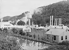 By the early 19th century, salt brines were discovered along the Kanawha River, and the first salt well was drilled in 1806.[13] This created a prosperous time and great economic growth for the area. By 1808, 1,250 pounds of salt were being produced a day, and the Farmers' Repository newspaper began publication.[14] An area adjacent to Charleston, Kanawha Salines (now Malden) would become the top salt producer in the world. The brines were heated over open flames causing the water to evaporate and leaving behind a residue of salt crystals. Much of the work was done by enslaved peoples. Historian Cyrus Forman estimated at the height of production as many as 3,000 slaves worked at more than 60 salt furnaces which operated 24 hours a day, seven days a week.[15] The Holly Grove Mansion was established during this period.[13] In 1818, the Kanawha Salt Company, the first trust in the United States, went into operation. In the same year, "Charlestown" was shortened to "Charleston" to avoid confusion with another Charles Town in eastern West Virginia, which was named after George Washington's brother, Charles Washington.[16] A lyceum was established around 1841.[17]