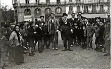 Meanwhile, Sydney Chaplin had joined Fred Karno's prestigious comedy company in 1906 and, by 1908, he was one of their key performers.[49] In February, he managed to secure a two-week trial for his younger brother. Karno was initially wary, and considered Chaplin a "pale, puny, sullen-looking youngster" who "looked much too shy to do any good in the theatre".[50] However, the teenager made an impact on his first night at the London Coliseum and he was quickly signed to a contract.[51] Chaplin began by playing a series of minor parts, eventually progressing to starring roles in 1909.[52] In April 1910, he was given the lead in a new sketch, Jimmy the Fearless. It was a big success, and Chaplin received considerable press attention.[53]