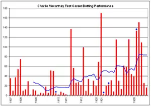 The war years divided Macartney's career in two. Prior to the war, he was primarily known as a bowling all-rounder. In 21 Tests, he had taken 34 wickets at 26 and scored 879 runs at 27, with one century.[16][33][34] After the war, Macartney transformed himself into one of the greatest batsmen of his era.[1] In his 14 post-war Tests, he scored 1,252 runs at nearly 70, with six centuries. His bowling became more sporadic, taking just 11 more wickets, averaging 32.[16][33][34]