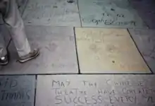 Heston became an icon for playing Moses in the hugely successful biblical epic The Ten Commandments (1956), selected by director Cecil B. DeMille, who thought Heston bore an uncanny resemblance to Michelangelo's statue of Moses.[35] DeMille cast Heston's three-month-old son, Fraser Clarke Heston, as the infant Moses. The Ten Commandments became one of the greatest box office successes of all time and is the eighth-highest-grossing film adjusted for inflation. His portrayal of the Hebrew prophet and deliverer was praised by film critics. The Hollywood Reporter described him as "splendid, handsome and princely (and human) in the scenes dealing with him as a young man, and majestic and terrible as his role demands it".[36] The New York Daily News wrote that he "is remarkably effective as both the young, princely Moses and as the Patriarchal savior of his people".[37] His performance as Moses earned him his first nomination for the Golden Globe Award for Best Actor – Motion Picture Drama and Spain's Fotogramas de Plata Award for Best Foreign Performer. When the Egyptian Theater reopened in December 1998, it screened Cecil B. DeMille's 1923 original The Ten Commandments, which had premiered there 75 years earlier. Charlton and Lydia Heston were honored guests at this opening showing and were seated with their longtime friends, brothers Charles Elias Disney and Daniel H. Disney.