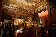 The Great Chamber is the largest in the State Apartments, followed by the State Drawing Room, the Second Withdrawing Room, the State Bedroom and finally the State Closet, each room being more private and ornate than the last. The Great Chamber has a painted ceiling of a classical scene by Antonio Verrio.[30] The Second Withdrawing Room was renamed the State Music Room when the 6th Duke brought the violin door from Devonshire House in London. It has a convincing trompe-l'œil of a violin and bow "hanging" on a silver knob, painted about 1723 by Jan van der Vaart.[31][32]