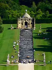 - The Cascade and Cascade House, a set of stone steps over which water flows from fountains at the top. It was built in 1696 and rebuilt more grandly in 1701. In 1703 a grand baroque Temple or Cascade House designed by Thomas Archer was added at the top. Major restoration of both in 1994–1996 took 10,000 man-hours of work. In 2004 the Cascade was voted England's best water feature by a panel of 45 garden experts chosen by Country Life.[34] It has 24 cut steps, each slightly different and with a variety of textures so that each gives a different sound when water runs over and down it.