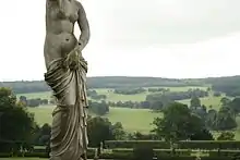 Chatsworth House is a stately home in the Derbyshire Dales, 3.5 miles (5.6 km) north-east of Bakewell and 9 miles (14 km) west of Chesterfield, England. The seat of the Duke of Devonshire, it has belonged to the Cavendish family since 1549. It stands on the east bank of the River Derwent, across from hills between the Derwent and Wye valleys, amid parkland backed by wooded hills that rise to heather moorland. The house holds major collections of paintings, furniture, Old Master drawings, neoclassical sculptures and books. Chosen several times as Britain's favourite country house,[2][3] it is a Grade I listed property from the 17th century, altered in the 18th and 19th centuries.[1] In 2011–2012 it underwent a £14-million restoration.[4] The owner is the Chatsworth House Trust, an independent charitable foundation formed in 1981, on behalf of the Cavendish family.[5]
