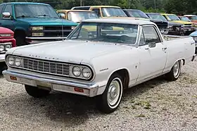 Chevrolet reintroduced the El Camino four years later based on the mid-size Chevrolet Chevelle. The 1964 model was similar to the Chevelle two-door wagon forward of the B-pillars and carried both "Chevelle" and "El Camino" badges, but Chevrolet marketed the vehicle as a utility model and the Chevelle's most powerful engines were not available. Initial engine offerings included six-cylinder engines of 194 and 230 cubic inches with horsepower ratings of 120 and 155 hp (89 and 116 kW), respectively. The standard V8 was a 283 cubic-inch Chevrolet small block with two-barrel carburetor and 195 hp (145 kW) with optional engines including a 220 hp (164 kW) 283 with four-barrel carburetor and dual exhausts. Added to the El Camino's option list during the course of the 1964 model year were two versions of the 327 cubic-inch small block V8 rated at 250 and 300 hp (186 and 224 kW)—the latter featuring a higher compression ratio of 10.5:1, larger four-barrel carburetor and dual exhausts.[8] El Caminos also featured Air shocks in the rear, as well as fully boxed frames. The shocks were continued over all generations, the frames only thru 1967.[9]