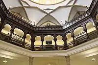 The museum building, built of locally quarried grey Kurla basalt and buff coloured trachyte Malad stone.[10] It is a three-storied rectangular structure, capped by a dome set upon a base, which adds an additional storey in the centre of the building. Built in the Western Indian and Indo-Saracenic style of architecture, the building accommodates a central entrance porch, above which rises a dome, tilled and modified well "tiled in white and blue flecks, supported on a lotus - petal base". A cluster of pinnacles, topped with miniature domes surround the central dome. The building incorporates features like Islamic dome with a finial along with protruding balconies and inlaid floors, inspired by Mughal palace architecture. The architect, George Wittet, modelled the dome on that of Golconda Fort and the inner vaulting arches on those at the Gol Gumbaz in Bijapur.[9][11] The interior of the museum combines the columns, railings and balcony of an 18th-century Wada (a Maratha mansion) with Jain style interior columns, which form the main body of the central pavilion below the Maratha balcony.[11]
