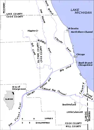 During the last ice age, the area that became Chicago was covered by Lake Chicago, which drained south into the Mississippi Valley. As the ice and water retreated, a short 12-to-14-foot (3.7 to 4.3 m) ridge was exposed about a mile inland, which generally separated the Great Lakes' watershed from the Mississippi Valley, except in times of heavy precipitation or when winter ice flows prevented drainage.[61] By the time Europeans arrived, the Chicago River flowed sluggishly into Lake Michigan from Chicago's flat plain. As Chicago grew, this allowed sewage and other pollution into the clean-water source for the city, contributing to several public health problems, like typhoid fever.[62] Starting in 1848, much of the Chicago River's flow was also diverted across the Chicago Portage into the Illinois and Michigan Canal.[63] In 1871, the old canal was deepened in an attempt to completely reverse the river's flow but the reversal of the river only lasted one season.[64]