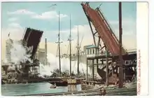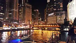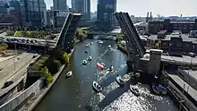 The first bridge across the Chicago River was constructed over the North Branch near the present day Kinzie Street in 1832. A second bridge, over the South Branch near Randolph Street, was added in 1833.[71] The first moveable bridge was constructed across the main stem at Dearborn Street in 1834.[72] Today, the Chicago River has 38 movable bridges spanning it, down from a peak of 52 bridges.[73] These bridges are of several different types, including trunnion bascule, Scherzer rolling lift, swing bridges, and vertical-lift bridges.