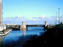 South of Belmont the North Branch is lined with a mixture of residential developments, retail parks, and industry until it reaches the industrial area known as the Clybourn Corridor.[23] Here it passes beneath the Cortland Street Drawbridge, which was the first 'Chicago-style' fixed-trunnion bascule bridge built in the United States,[24] and is designated as an ASCE Civil Engineering Landmark and a Chicago Landmark.