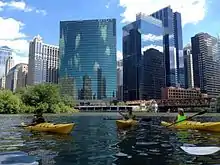 The Chicago River is a system of rivers and canals with a combined length of 156 miles (251 km)[1] that runs through the city of Chicago, including its center (the Chicago Loop).[2] Though not especially long, the river is notable because it is one of the reasons for Chicago's geographic importance: the related Chicago Portage is a link between the Great Lakes and the Mississippi River Basin, and ultimately the Gulf of Mexico.