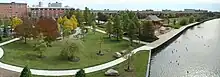 Early settlers named the North Branch of the Chicago River the Guarie River, or Gary's River, after a trader who may have settled the west bank of the river a short distance north of Wolf Point, at what is now Fulton Street.[12][13] The source of the North Branch is in the northern suburbs of Chicago where its three principal tributaries converge. The Skokie River—or East Fork—rises from a flat area, historically a wetland, near Park City, Illinois to the west of the city of Waukegan.[14] It then flows southward, paralleling the edge of Lake Michigan, through wetlands, the Greenbelt Forest Preserve and a number of golf courses towards Highland Park, Illinois.[15] South of Highland Park the river passes the Chicago Botanic Gardens and through an area of former marshlands known as the Skokie Lagoons. The Middle Fork arises near Rondout, Illinois and flows southwards through Lake Forest and Highland Park. These two tributaries merge at Watersmeet Woods west of Wilmette. From there the North Branch flows south towards Morton Grove.[16] The West Fork rises near Mettawa and flows south through Lincolnshire, Bannockburn, Deerfield, and Northbrook, meeting the North Branch at Morton Grove.[17] In recognition of the work of Ralph Frese in promoting canoeing on and conservation of Chicago-area rivers, the forest preserve district of Cook County, Illinois has designated a section of the East Fork and North Branch from Willow Road in Northfield to Dempster Street in Morton Grove the Ralph Frese River Trail.[18][19]