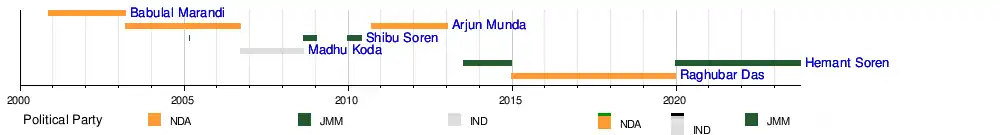 Six people have served as the state's chief minister since Jharkhand's formation on 15 November 2000.[2] Half of them, including the inaugural officeholder Babulal Marandi, represented the Bharatiya Janata Party (BJP). His successor Arjun Munda, also from the BJP, is the longest-serving chief minister; he served for over five years, across three terms but never completed a full term. Two chief ministers, Shibu Soren and his son Hemant Soren, represented the Jharkhand Mukti Morcha (JMM). Shibu Soren's first term ended in just ten days, as he could not prove that he had the support of a majority of the house and was forced to resign. The state has also been governed by Madhu Koda, one of the few independents to become the chief minister of any state.[3] In between their reigns, the state has also been under President's rule three times. Raghubar Das, of the BJP, was the first non-tribal and first chief minister to complete a full term in the state. Hemant Soren of the Jharkhand Mukti Morcha is the incumbent chief minister.
