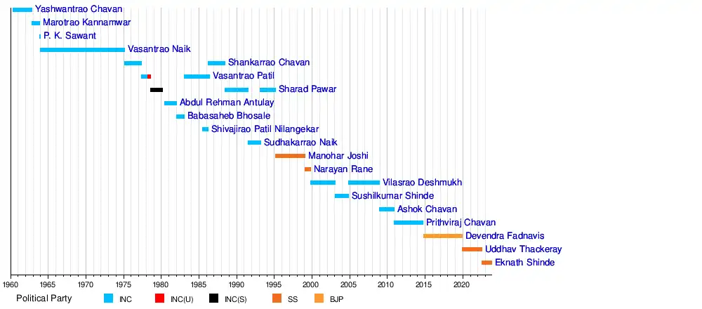 Maharashtra was formed by dissolution of Bombay State and Hyderabad State on 1 May 1960.[3] Yashwantrao Chavan, who was serving as the third CM of Bombay State since 1956, became the first CM of Maharashtra. He belonged to the Indian National Congress and held the office until the 1962 Assembly elections. Marotrao Kannamwar succeeded him and was the only CM to die while in office.[4][5] Vasantrao Naik, who was in office from December 1963 to February 1975 for more than 11 years, has by far been the longest serving CM. He also was the first and only CM to complete his full term of five years (1967-1972) till Devendra Fadnavis matched it (2014-2019). With the exceptions of Manohar Joshi (SS), Narayan Rane (SS), Devendra Fadnavis (BJP), Uddhav Thackeray (SS) and Eknath Shinde (SS), all other CMs have been from the Congress or its breakaway parties.[6][7][8]