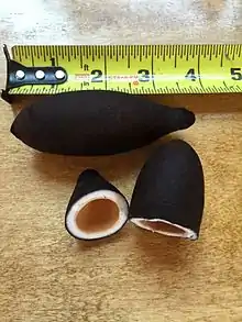 Chorioactis is a genus of fungi that contains the single species Chorioactis geaster.[4] The mushroom is commonly known as the devil's cigar or the Texas star in the United States, while in Japan it is called kirinomitake (キリノミタケ). This extremely rare mushroom is notable for its unusual appearance and disjunct distribution; it is found only in select locales in Texas and Japan. The fruit body, which grows on the stumps or dead roots of cedar elms (in Texas) or dead oaks (in Japan), somewhat resembles a dark brown or black cigar before it splits open radially into a starlike arrangement of four to seven leathery rays. The interior surface of the fruit body bears the spore-bearing tissue known as the hymenium, and is colored white to brown, depending on its age. The fruit body opening can be accompanied by a distinct hissing sound and the release of a smoky cloud of spores.