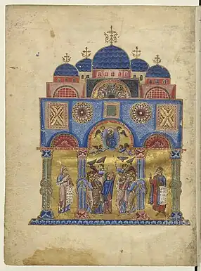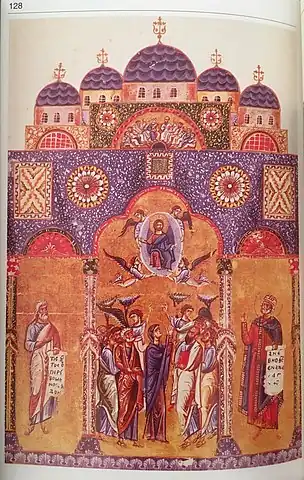 A tenth-century poem by Constantine the Rodian, or Constantine of Rhodes, preserved in a fifteenth-century manuscript, contains an ekphrasis and description of the church.[12] The domes appear to have been drastically altered between 944 and 985 by the addition of windowed drums beneath all five domes and by raising the central dome above than the others.[13] The 12th-century writer Nicholas Mesarites also recorded a description of the church Archived 2015-12-12 at the Wayback Machine, of which only fragments survive.[14] Although there are brief mentions of the building in a variety of sources, the accounts of Procopius, Constantine of Rhodes, and Nicholas Mesarites are the only substantial textual descriptions of the building's appearance to have survived.[12]