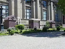 Although the sarcophagi of the emperors were raided by Crusaders during the Fourth Crusade in 1204, some of the oldest porphyry sarcophagi have survived: two in the atrium of the Hagia Eirene, four outside the Archaeological Museum, and a fragment of a seventh in the museum's "Istanbul through the Ages" pavilion; this fragment is believed to be from the sarcophagus of Constantine I.[8]