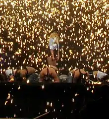 Spears' live comeback and promotional activities for Circus began on November 6, 2008, with a cameo appearance at the Dodger Stadium show of Madonna's Sticky & Sweet Tour (2008–2009). Midway through the performance of "Human Nature", Spears joined Madonna on stage.[66] The week prior to the album's release, Spears performed in several countries as a part of the Circus Promo Tour. On November 27, Spears performed "Womanizer" live at the 2008 Bambi Awards in Offenburg, Germany, where she received an award for Best International Pop Star.[67] In addition, she performed the song on Star Academy in France the following day and on The X Factor in the United Kingdom on November 29.[68] Her performance on The X Factor was watched by an average of 11,880,000 citizens in the UK.[69] Spears premiered the second single "Circus" alongside "Womanizer" at the Big Apple Circus on Good Morning America on December 2.[70][71] On December 16, she performed on Nippon TV's Best Artist of 2008.[72]